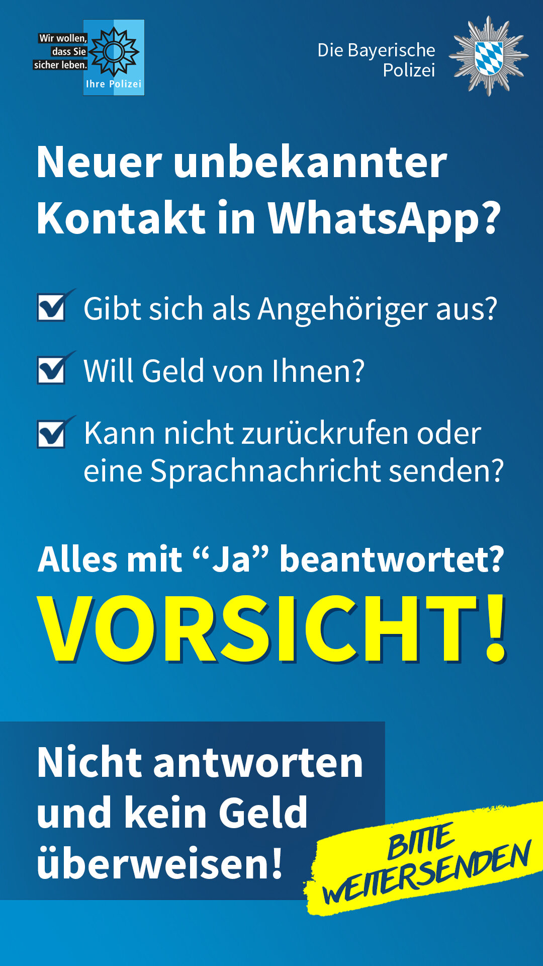 Weitere Informationen sowie ein Video zu einem Chatverlauf finden Sie unter: https://www.polizei.bayern.de/Messengerbetrug