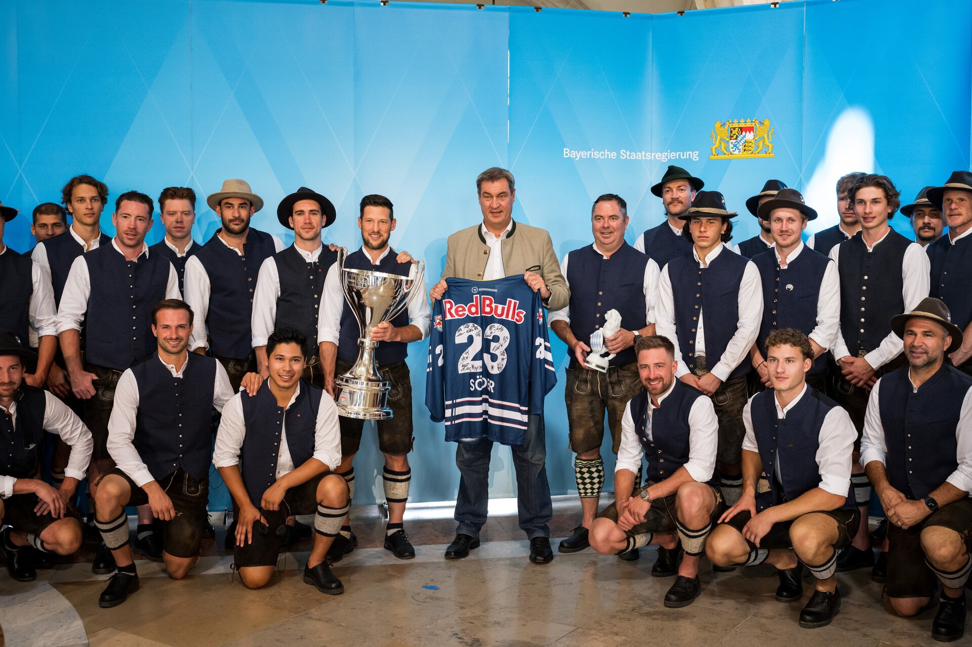 Der EHC Red Bull München ist in der abgelaufenen Eishockey-Saison Deutscher Meister geworden. Unteranderem mit dabei: Unsere Oberland-Spieler Maxi Kastner aus Farchant, sowie Yasin Ehliz aus Bad Tölz und Konrad Abeltshauser aus Bad Heilbrunn. Heute ist die Meistermannschaft in der Bayerischen Staatskanzlei zu Gast. Ministerpräsident Söder empfängt das Team am Vormittag im Kuppelsaal.