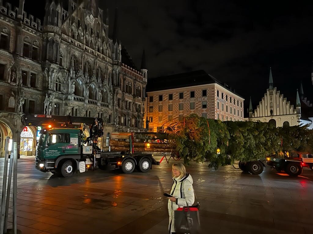 Gestern Vormittag ist er in Königsdorf gefällt worden, heute wird er in München aufgebaut. Der Christbaum vor dem Rathaus am Marienplatz. In der Nacht ist die 25 Meter hohe Fichte im Tölzer Land geholt und mit einem Tieflader nach München transportiert worden. Jetzt muss die Berufsfeuerwehr den Baum in ein tiefes Bodenloch versenken und verkeilen. Die 3.000 Lichter erleuchten dann zum ersten Mal in gut drei Wochen, wenn der Christkindlmarkt beginnt.