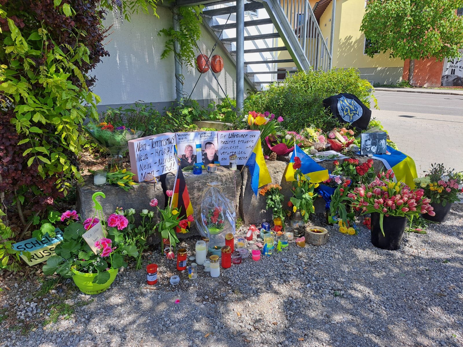 Der Tatort hat sich mittlerweile eine Art Pilgerstätte entwickelt. Viele Menschen legten dort Blumen nieder, verharrten im stillen Gebet. Neben Blumen und Kerzen waren am Montag Bilder der beiden Getöteten und die ukrainische Flagge zu sehen.