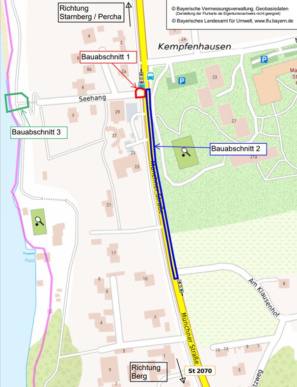 Unbekannte Ver- und Entsorgungsleitungen hätten den Bauablauf erschwert, so die Behörde. Außerdem sei ein unbekanntes Hangwasser festgestellt worden. Deshalb habe sich die Bauzeit deutlich verlängert. Bis auf weiteres bleibt die halbseitige Sperrung der Staatsstraße im Ortsbereich bestehen. In der letzten Projektphase müsse außerdem die Einmündung „Am Klausenhof“ gesperrt werden. In dieser Zeit kann der Bereich am Seeufer nur mit Einschränkungen genutzt werden. Ziel der Maßnahmen: weniger Schadstoffe sollen in den Starnberger See gelangen.