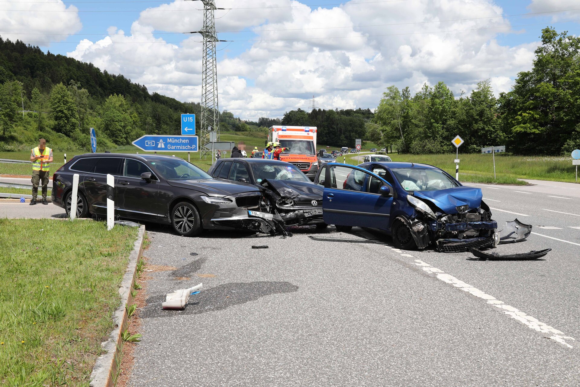 An der Autobahnauffahrt zur A95 bei Großweil sind heute drei Autos zusammengeprallt. Eine Frau und ihre zwei Kinder wollten von Schwaiganger kommend auf die Autobahn auffahren. Dabei übersah sie ein entgegenkommendes Auto. Durch den Frontalzusammenstoß schleuderte einer der Wagen in ein drittes Auto. Fünf Personen, darunter auch die beiden Kinder, wurden leicht bis mittelschwer verletzt. 22 Ehrenamtliche der Feuerwehr Großweil waren im Einsatz, um die Unfallstelle abzusichern. Mindestens an zwei Fahrzeugen entstand Totalschaden.