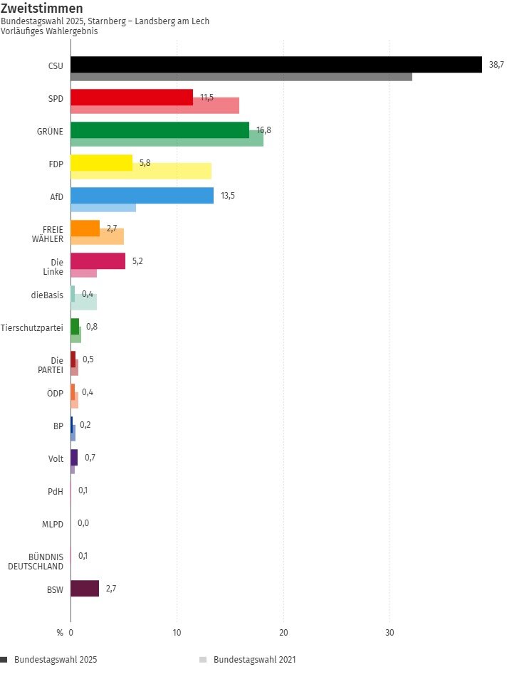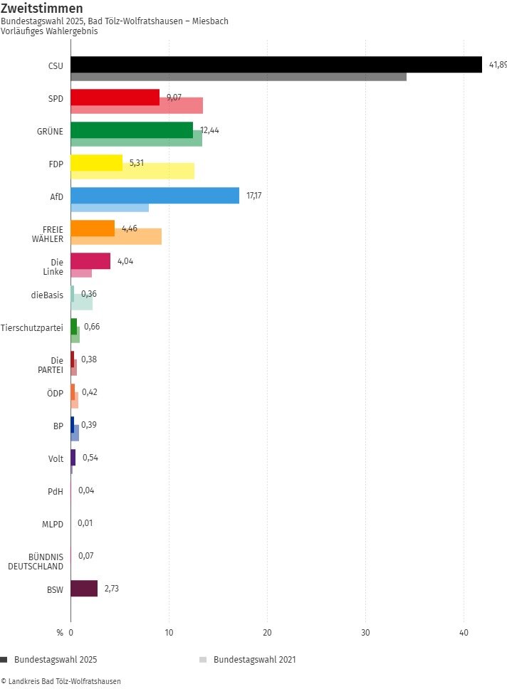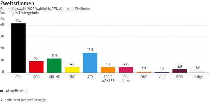 Das Oberland hat gewählt: In allen drei Wahlkreisen ist die CSU laut vorläufigem Endergebnis der Bundestagswahl die stärkste Kraft. Dahinter liegt in den Wahlkreisen Weilheim und Bad Tölz-Wolfratshausen die AfD, im Wahlkreis Starnberg-Landsberg am Lech sind die Grünen zweitstärkste Kraft. Im Vergleich zur letzten Bundestagswahl haben FDP und Freie Wähler in unserer Heimat deutlich an Stimmen verloren. Zugelegt hat dagegen Die Linke. Die Wahlbeteiligung in allen Oberland Wahlkreisen lag bei über 85 Prozent.