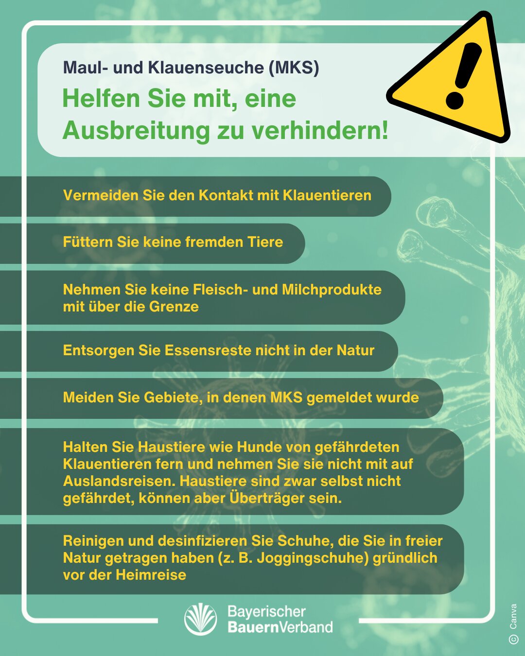Denn die Fälle von Maul- und Klauenseuche in diesem Bereich häufen sich aktuell. Carl von Butler, Generalsekretär des Bayerischen Bauernverbandes, bittet um den Verzicht Fleisch- und Milchprodukte als Mitbringsel aus dem Ausland ins Oberland zu bringen. Zwar ist die Maul- und Klauenseuche ungefährlich für den Menschen, für Klauentiere wie Rinder, Schweine oder Schafe aber verheerend.
