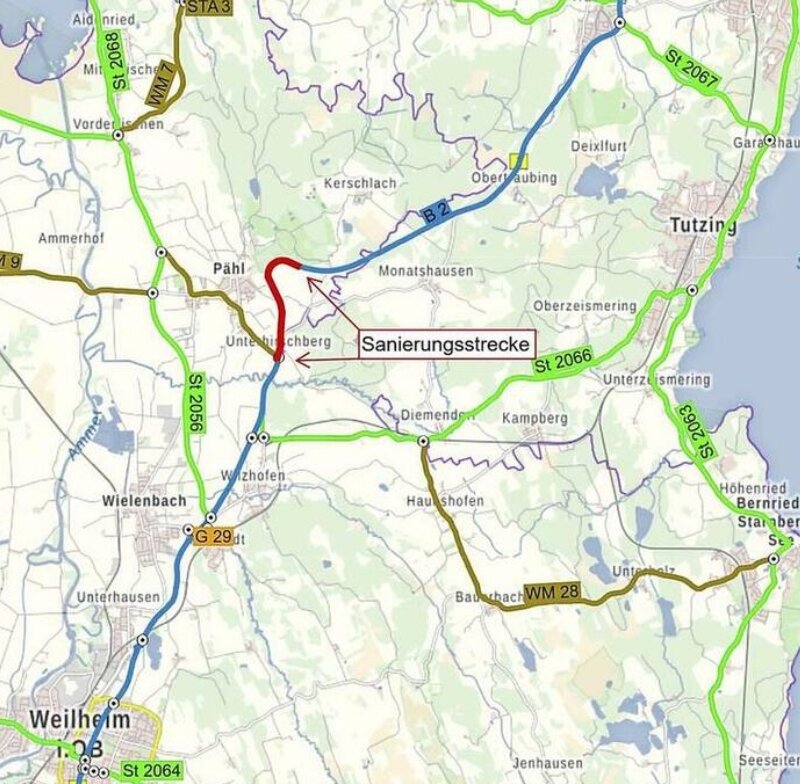 Wichtig für alle Autofahrer: Auf der B2 am Hirschberg startet ein Millionenprojekt. Bei Pähl muss die Fahrbahn auf einer Strecke von zwei Kilometern erneuert werden. Gearbeitet wird in zwei Etappen. In der ersten Phase wird im dreistreifigen Bereich der B2 ab heute eine Fahrspur gesperrt. Phase zwei beginnt in den Pfingstferien. Dann ist der Hirschberg komplett dicht und der Verkehr wird über Andechs umgeleitet. Die Kosten für die Baumaßnahme liegen bei 1,4 Millionen Euro.