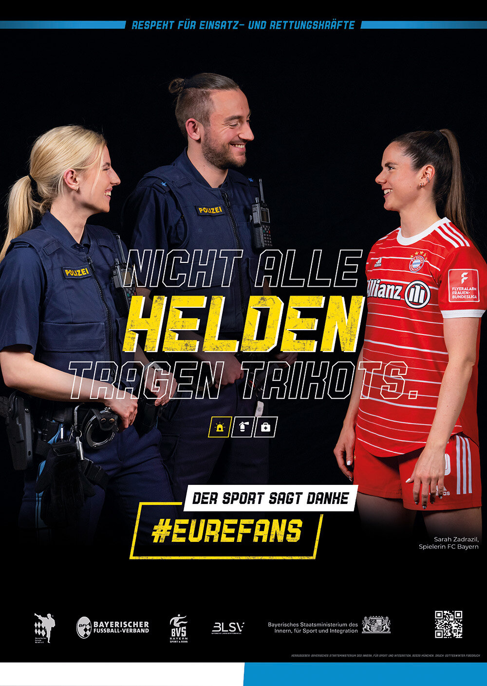 Feuerwehr, Polizei und Rettungskräfte trainieren und geben vollen Einsatz für unsere Sicherheit. Und das 365 Tage im Jahr und 24 Stunden am Tag. Um für mehr Respekt zu werben und ein Zeichen gegen Gewalt an Einsatzkräfte zu setzen, läuft seit zwei Jahren in Bayern eine Social Media und Plakat-Kampagne. Heute Vormittag will Innenminister Herrmann eine Zwischenbilanz zur Aktion ziehen. Unter dem Motto „Nicht alle Helden tragen Trikots“ wird dabei zusammen mit Sportverbänden eine Brücke zwischen den Idolen des Sports und den ehrenamtlichen Einsatzkräften geschlagen.