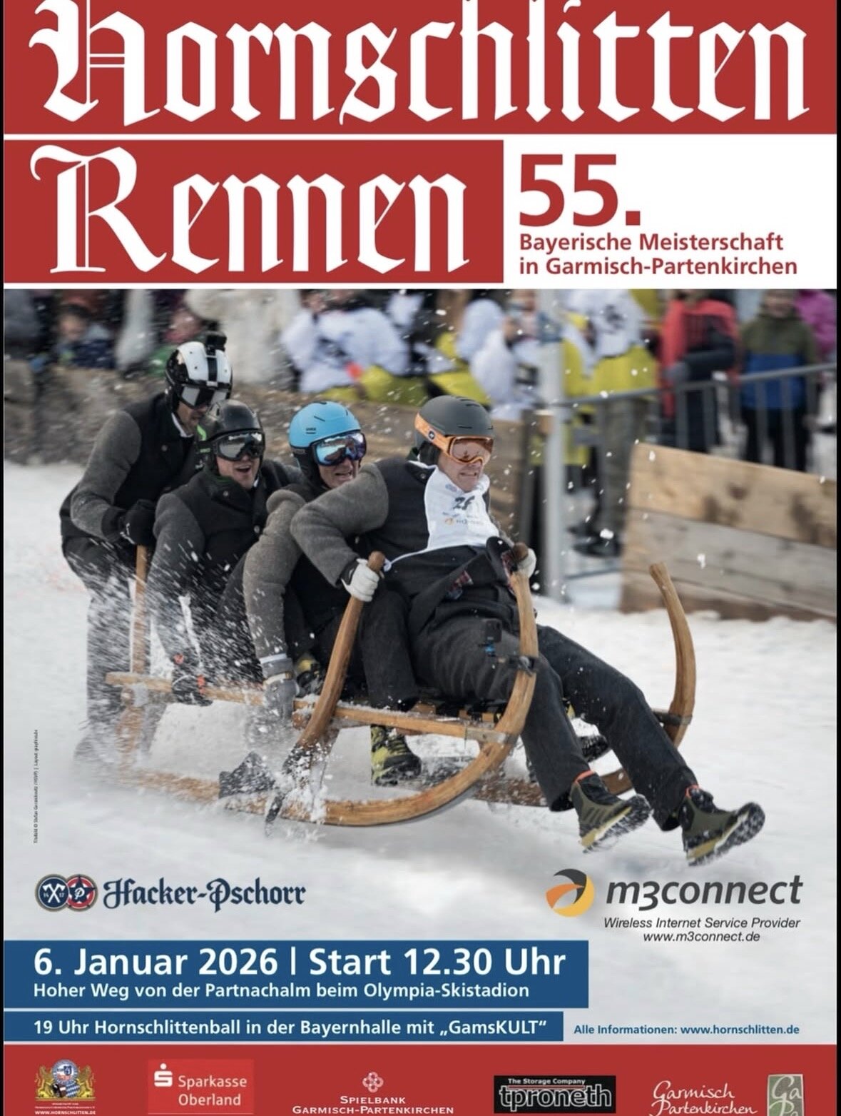 Rasanter Wintersport und gelebte Tradition: In Garmisch-Partenkirchen steigt heute wieder das Hornschlittenrennen. Bereits zum 55. Mal jagen Viererteams auf historischen Holzschlitten den „Hohen Weg“ von der Partnachalm ins Tal – mit Geschwindigkeiten von bis zu 100 Stundenkilometern. Gefahren wird um den Titel des Bayerischen Meisters. Für Zuschauer gibt es eine Großbildleinwand mit mehreren Kameras entlang der Strecke. Das Rennen gilt als eines der urbayrischsten Winterspektakel der Region.