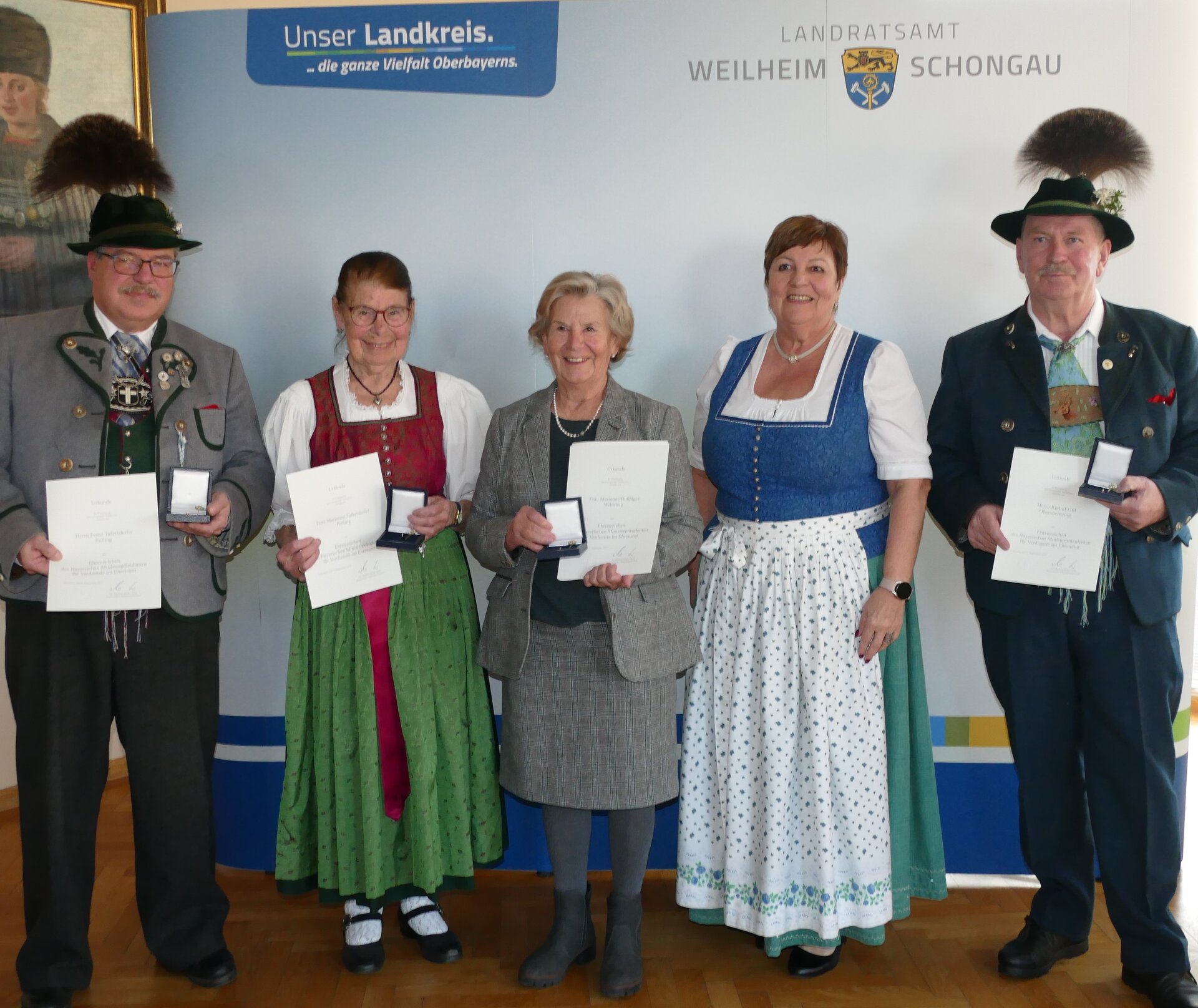 Ausgezeichnet wurden Marianne Bußjäger aus Wildsteig sowie Marianne und Franz Tafertshofer aus Polling und Rudolf Ottl aus Obersöchering. Sie engagieren sich seit Jahrzehnten unter anderem in Sport- und Trachtenvereinen und bei Dorffesten. Landrätin Andrea Jochner-Weiß dankte den Geehrten für ihren außergewöhnlichen Einsatz für das Gemeinwohl und den gesellschaftlichen Zusammenhalt.