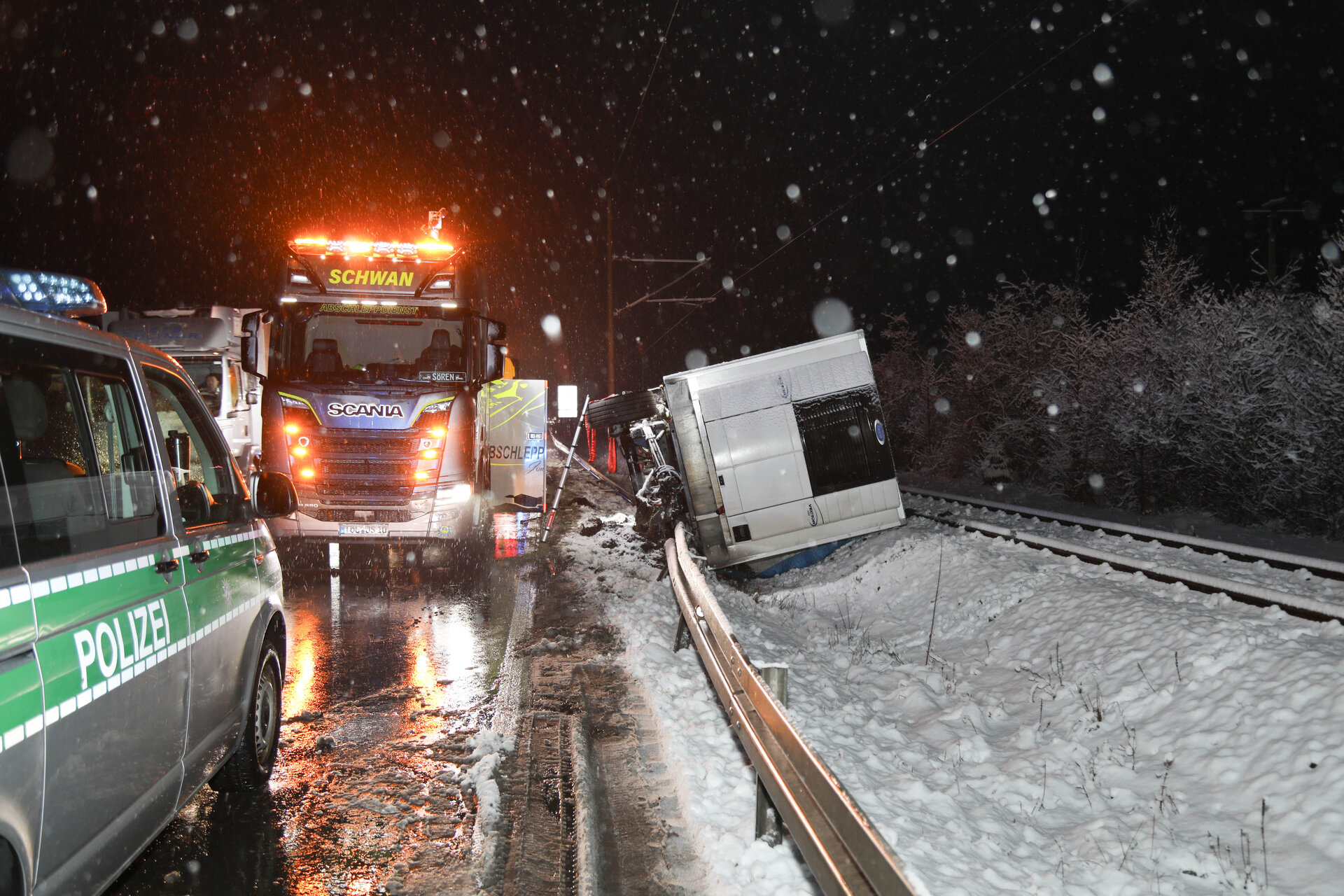 Wie die Polizei mitteilt, kam der 50-jährige LKW-Fahrer auf schneeglatter Straße ins Schlingern und krachte in die Leitplanke. Der Anhänger wurde über die Leitplanke in das dahinterliegende Gleisbett geschleudert. Der Fahrer blieb unverletzt, zum Schaden machte die Polizei noch keine Angaben. Die LKW musste geborgen werden und die Sperrungen konnten gegen 11 Uhr aufgehoben werden. Auch die Bahnstrecke zwischen Murnau und Garmisch-Partenkirchen ist wieder frei.