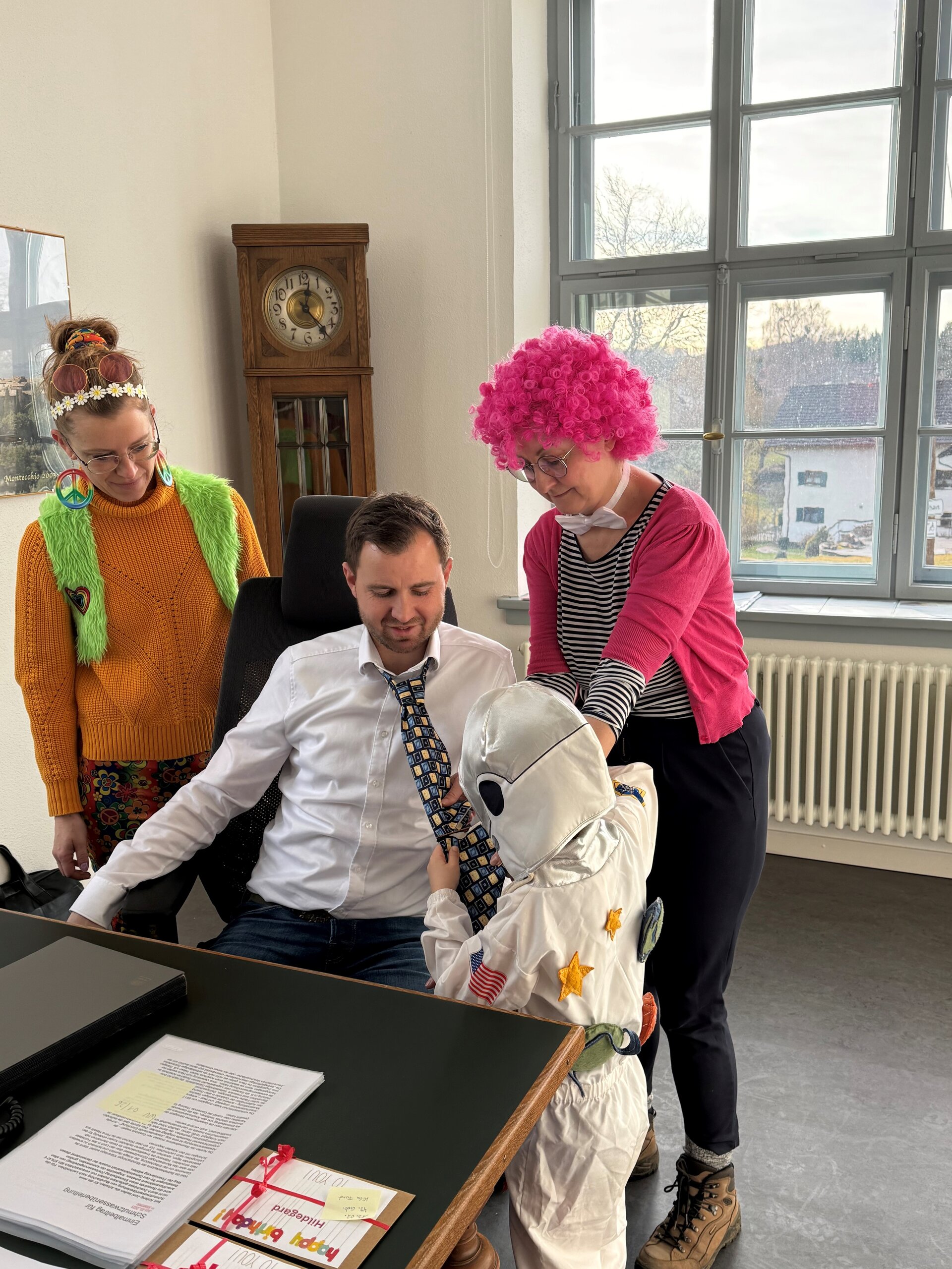 Das Rathaus in Wessobrunn ist am heutigen lumpigen Donnerstag zur närrischen Hochburg geworden. Die Kinder des örtlichen Kindergartens hatten es auf die Krawatte von Bürgermeister Georg Guggemos abgesehen – ganz nach Weiberfastnacht-Tradition. Der Bürgermeister nahm’s mit Humor und belohnte den erfolgreichen Einsatz mit Schokoküssen. Für Stimmung sorgte danach Musik, die von den Kindern ausgewählt wurde. Zum Start in die heiße Phase des Faschings hatten im Wessobrunner Rathaus also ganz klar die Kleinsten das Kommando.