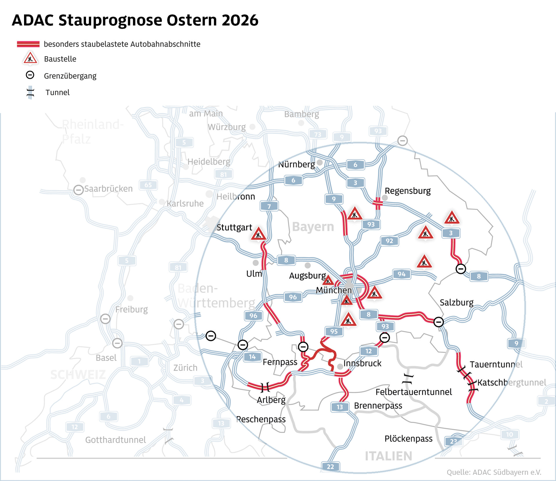 Vor dem Osterurlaub kommt der Stau. Wer ab heute verreisen will, dem droht viel und zäher Verkehr. In zehn Bundesländern beginnen am Wochenende die Osterferien – der ADAC rechnet deshalb mit vielen Staus auf den Autobahnen. Besonders eng werden dürfte es im Oberland heute Nachmittag und am Samstag. Die meisten Urlauber fahren nach ADAC-Einschätzung über die A95, die B2 und die Fernpassstrecke in die Wintersportgebiete oder in südliche Urlaubsländer, um dort die Ostertage zu verbringen. Wer entspannt unterwegs sein will, sollte den Sonntag für die Anreise wählen.