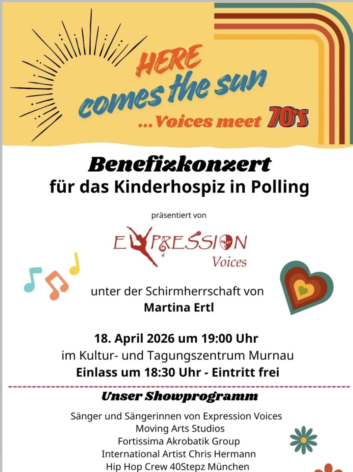 Im Kultur- und Tagungszentrum Murnau steigt morgen ein Konzert für den guten Zweck. Organisiert von der Gesangsschule „Expression Voices und unter der Schirmherrschaft von der ehemaligen Ski-Weltmeisterin und Olympiamedaillengewinnerin Martina Ertl findet ein Benefizkonzert für das Kinderhospiz in Polling statt. Verena Cereni-Nießner von der „Expression Voices“ über die Veranstaltung: