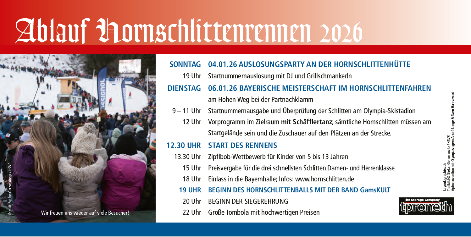 Gestartet wird das Rennen direkt an der Partnachalm – immer am 6. Januar. Die Mischung aus spannender Sekundenjagd und winterlicher Pistengaudi macht die Bayerische Meisterschaft im Hornschlittenrennen zu einem echten urbayrischen Erlebnis das man nicht verpassen darf ! Auch diesjährig wird eine Großbildleinwand (mit 5 Kameras), zur Einsicht auf die komplette Rennstrecke, zum Einsatz kommen !