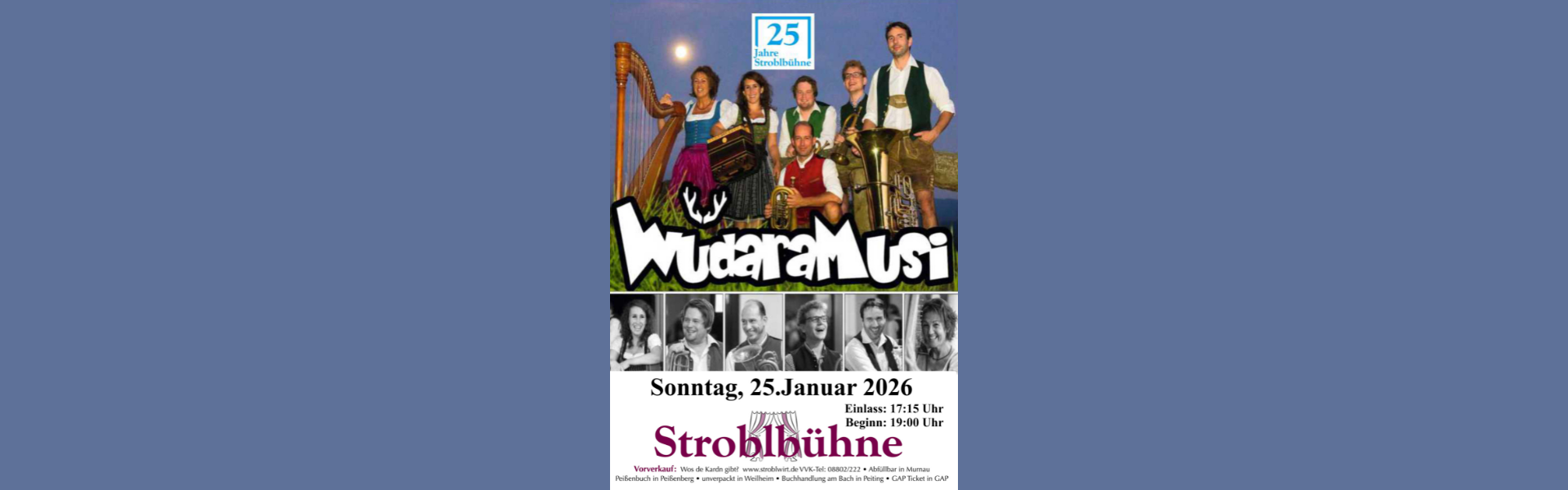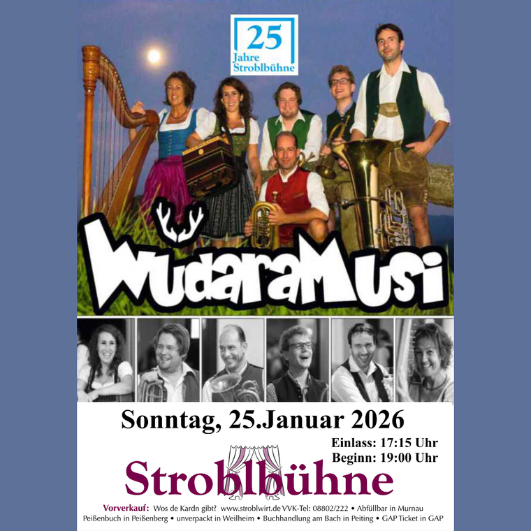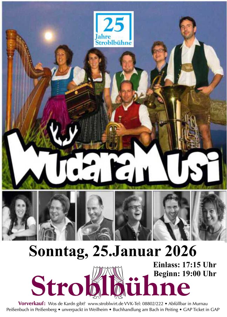 schussgewaltige Startformation der WüdaraMusi mit zwei Musikantinnen und vier Musikanten ab dem Jahre 2008 dieses Musikvakuum mit markantem Bläserklang und speziell arrangierten Stücken auffüllen und unter die Leute bringen. Nach anfänglichen musikalischen Erkundungsjahren wildern sie nun seit 2012 quer durch den alpenländischen Raum - ihnen allen blüht ein Leben auf der Überholspur. Im Kofferraum: Alpenländisches, Krainerisches, Schnulziges und Selbst-Erlegtes.