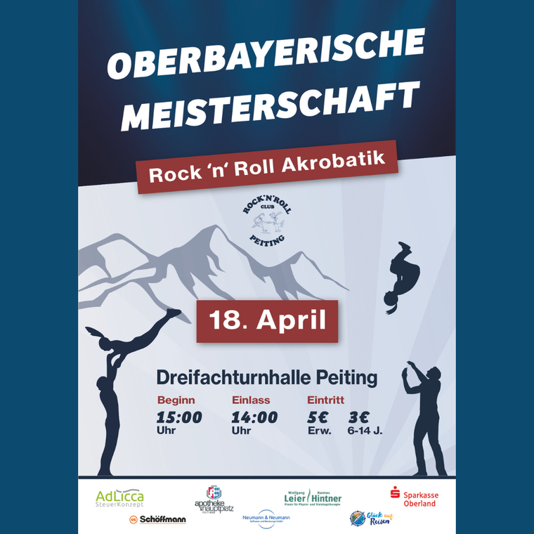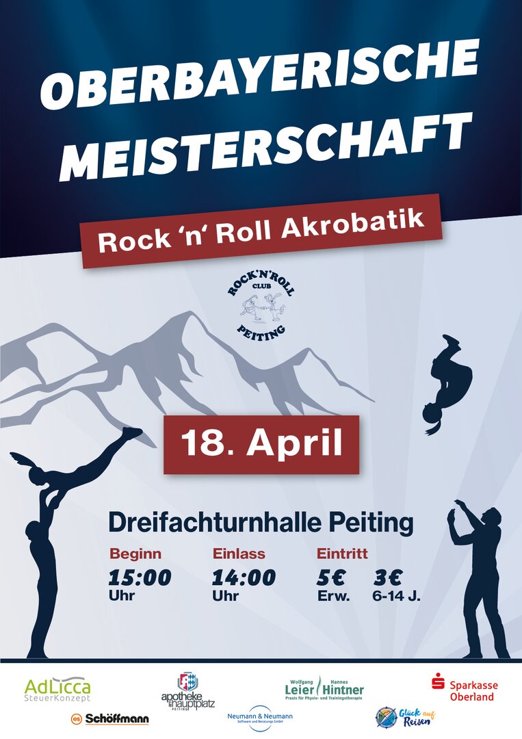 Am Samstag, den 18. April findet die Oberbayerische Meisterschaft in Rock’n‘ Roll Akrobatik in Peiting statt. Beginn der Veranstaltung ist um 15 Uhr. Der Einlass für Zuschauer in die Sporthalle beginnt bereits ab 14 Uhr. Für Essen und Trinken, Kaffee und Kuchen ist gesorgt.