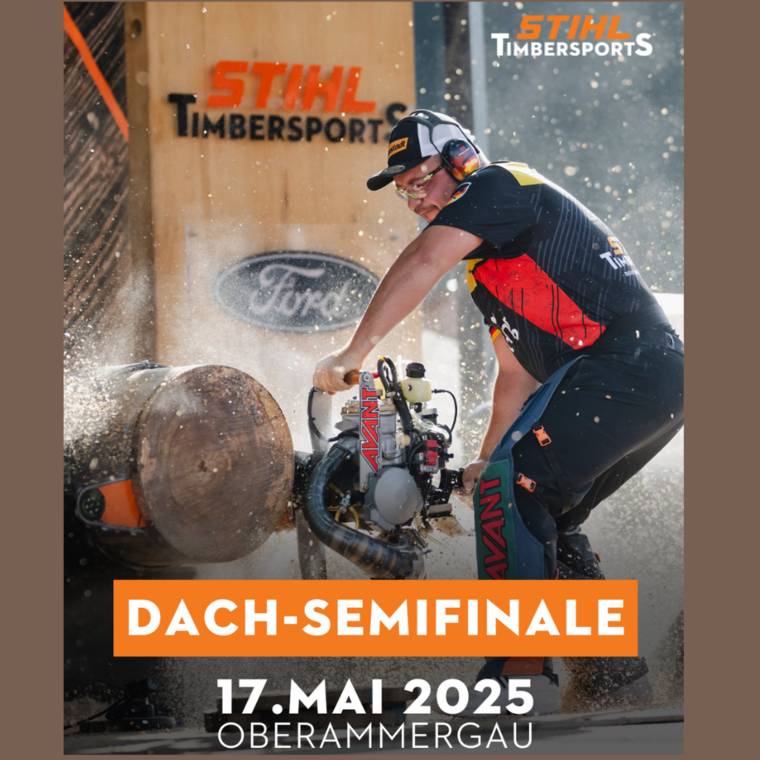 Das Oberammergauer Passionstheater feiert eine sportliche Premiere: Am 17. Mai 2025 findet hier von 10-18 Uhr das erste Semifinale der DACH-Meisterschaft (Deutschland, Österreich, Schweiz) statt. Sportholzfällerinnen und -holzfäller eröffnen erstmals die neu gegründete gemeinsame Wettkampfserie. In sechs Disziplinen mit Axt und Säge werden Punkte gesammelt, die für eine Finalteilnahme Ende August in der Schweiz benötigt werden.