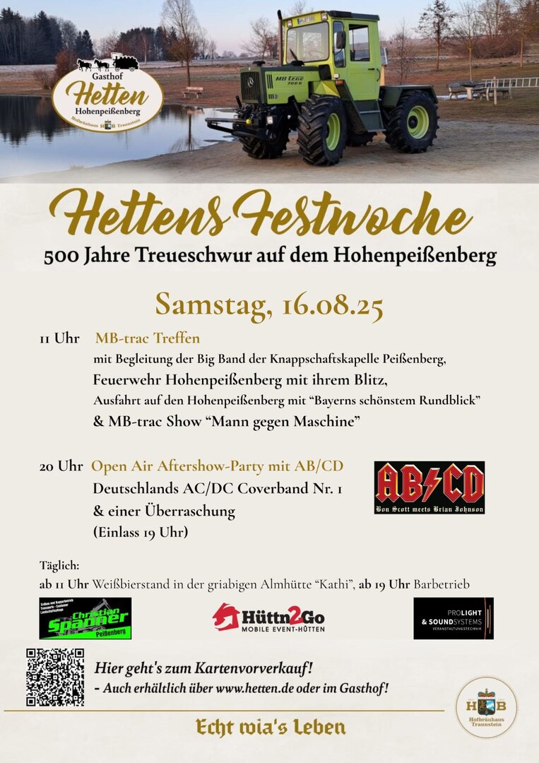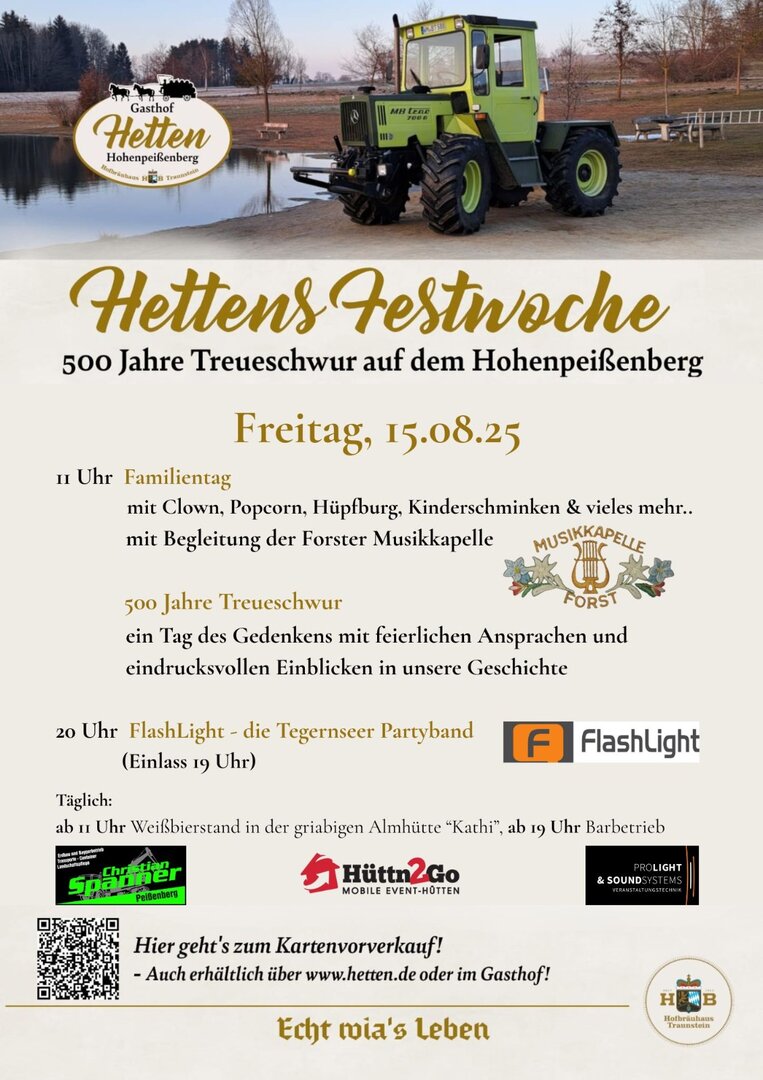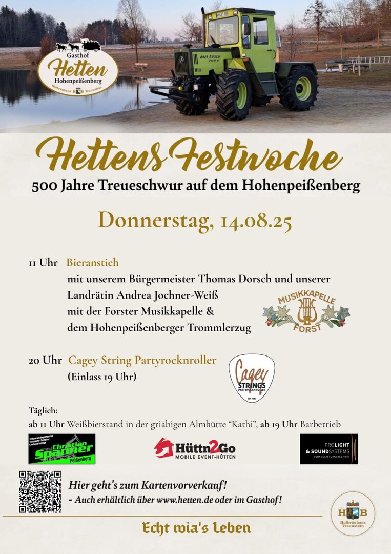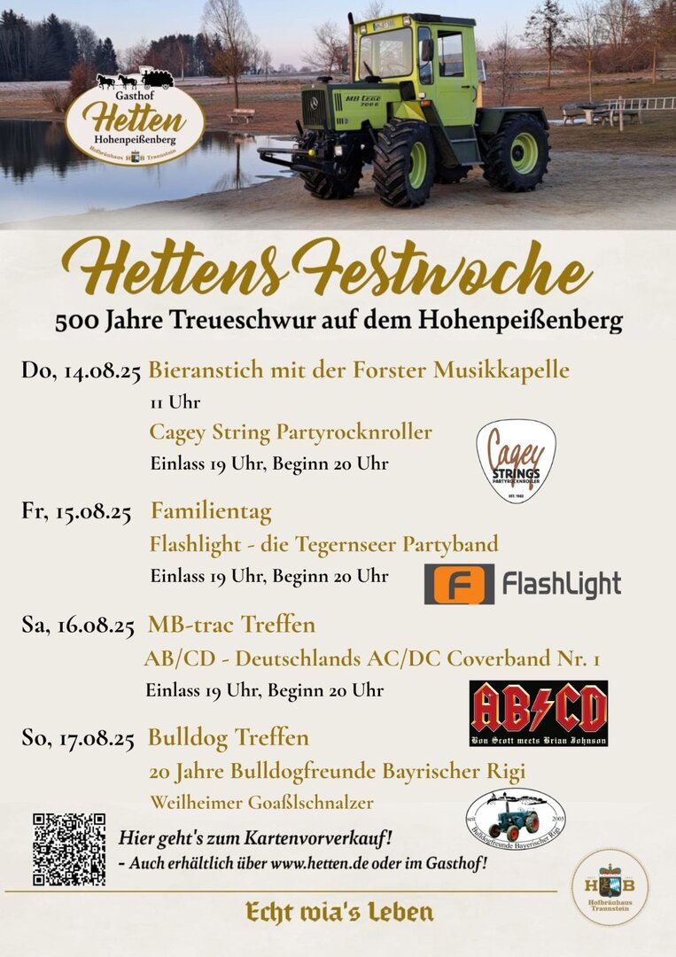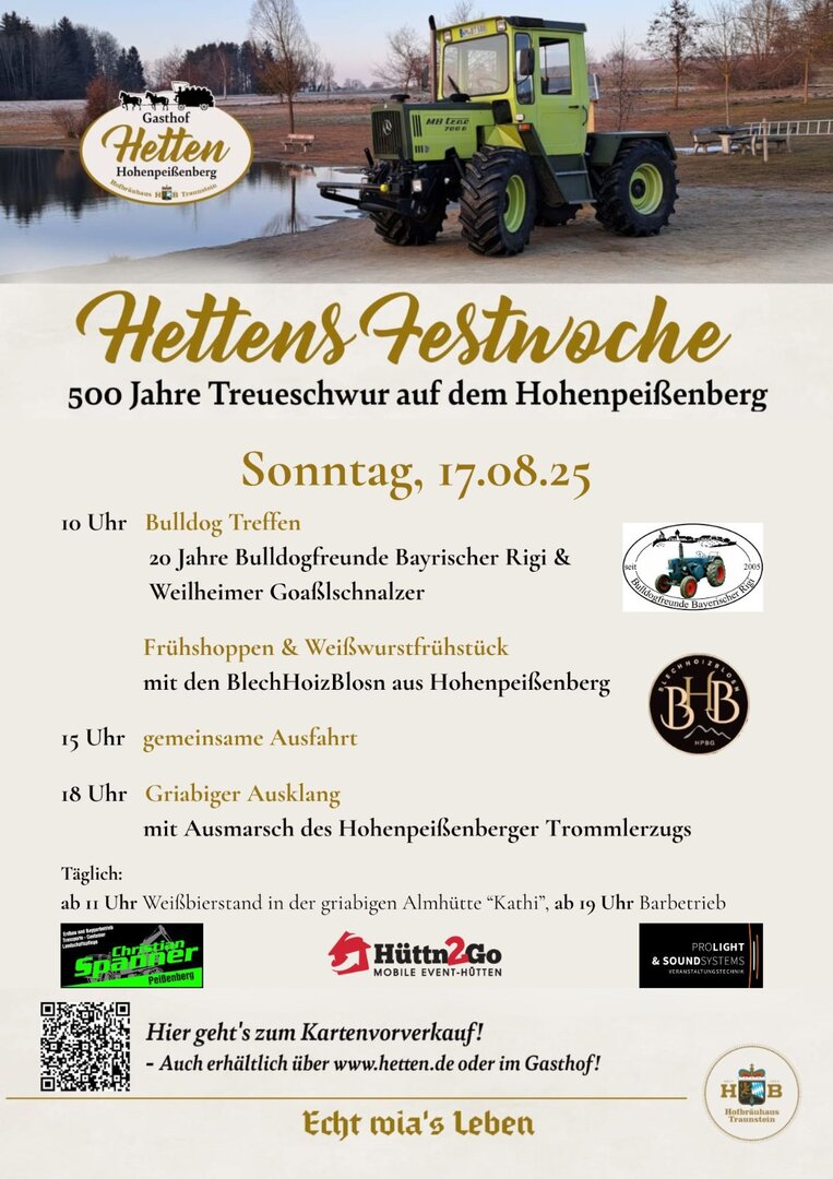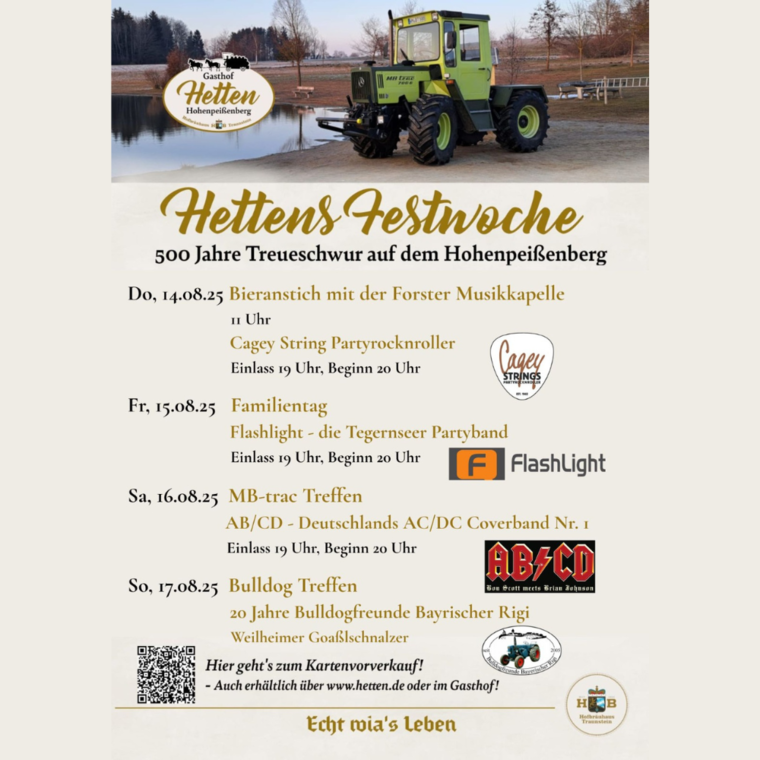 Vom 14. bis 17. August lädt das Gasthaus Hetten zur „Hettens Festwoche“ in Hohenpeißenberg ein. An vier Tagen erwartet Besucher ein abwechslungsreiches Programm mit Musik, Familienaktionen, historischen Feierlichkeiten sowie MB-Track- und Bulldog-Treffen.