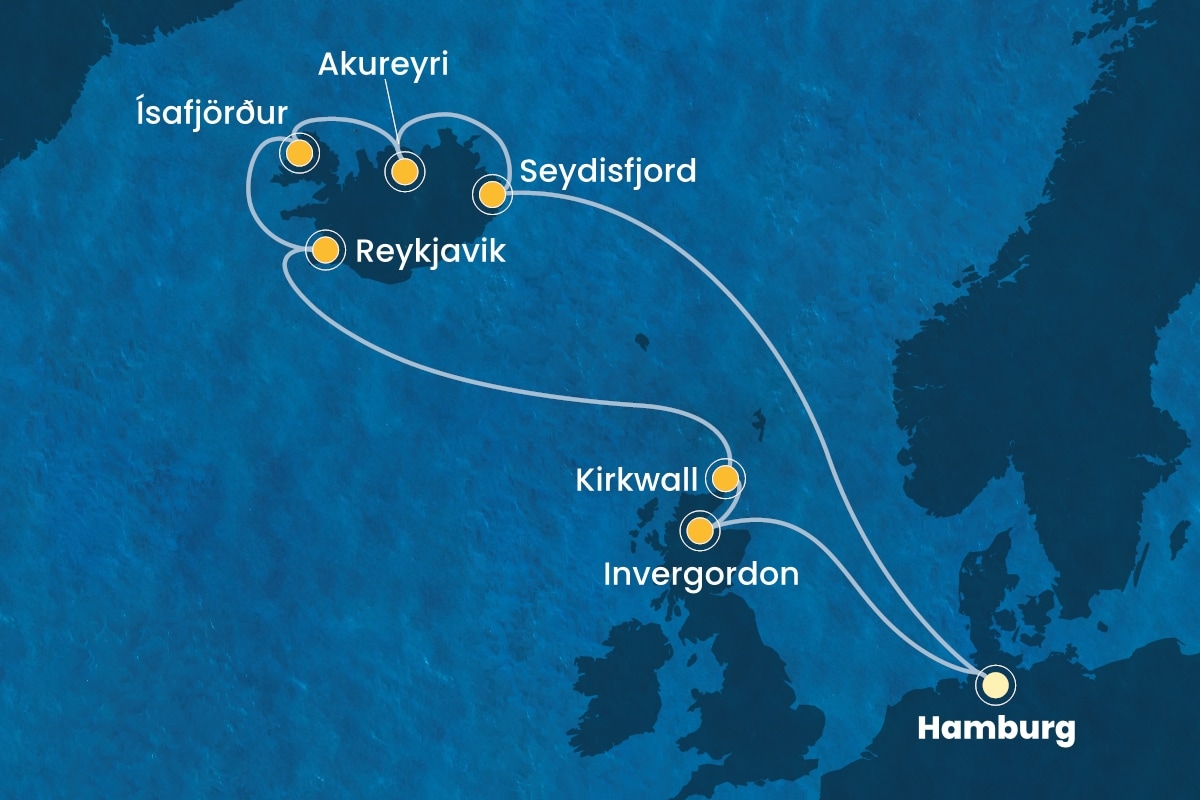 Unsere gemeinsame Reise beginnt im Juli in Hamburg und führt uns mit 2 Seetagen direkt nach Island. Ein Island Urlaub ist eine einzigartige Reise in atemberaubende Landschaften. Wanderungen durch Vulkanlandschaften, Gletschertouren, Entspannung in heißen Quellen und magische Nordlichter – das erleben Sie nur auf Island. Direkt im Anschluss besuchen wir dann noch zwei Häfen in Schottland.